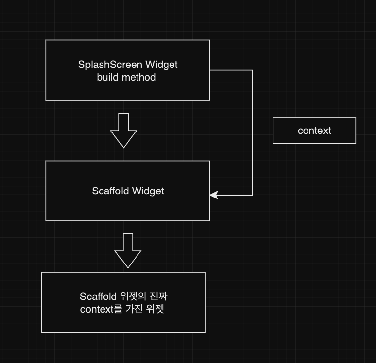 - 지금 사용하는 context는 SplashScreen만의 정보를 담고 있고 Scaffold위젯의 정보를 담고 있지 않다.
