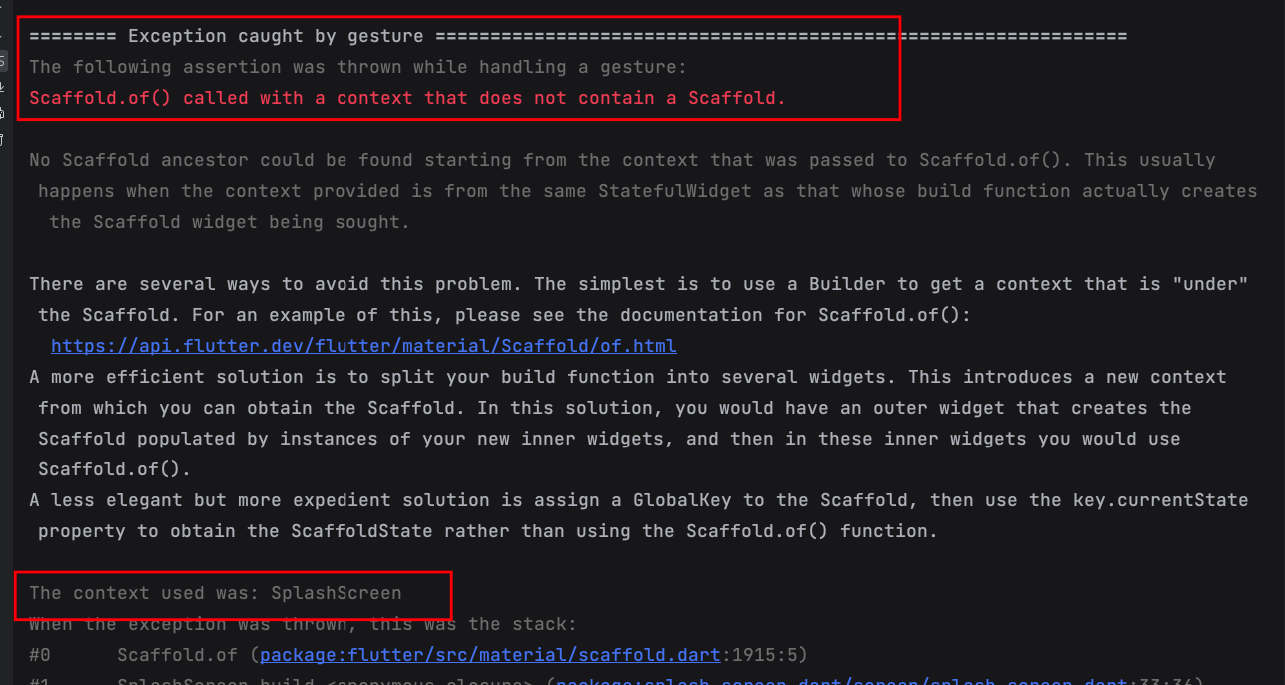 위의 소스에서 보다시피 Scaffold.of(ctx)는 저기 SplashScreen에 있는 context를 참조하는 것이 아니라 Builder가 새로 만든 context를 참조하여 로직을 실행하게 되었다.