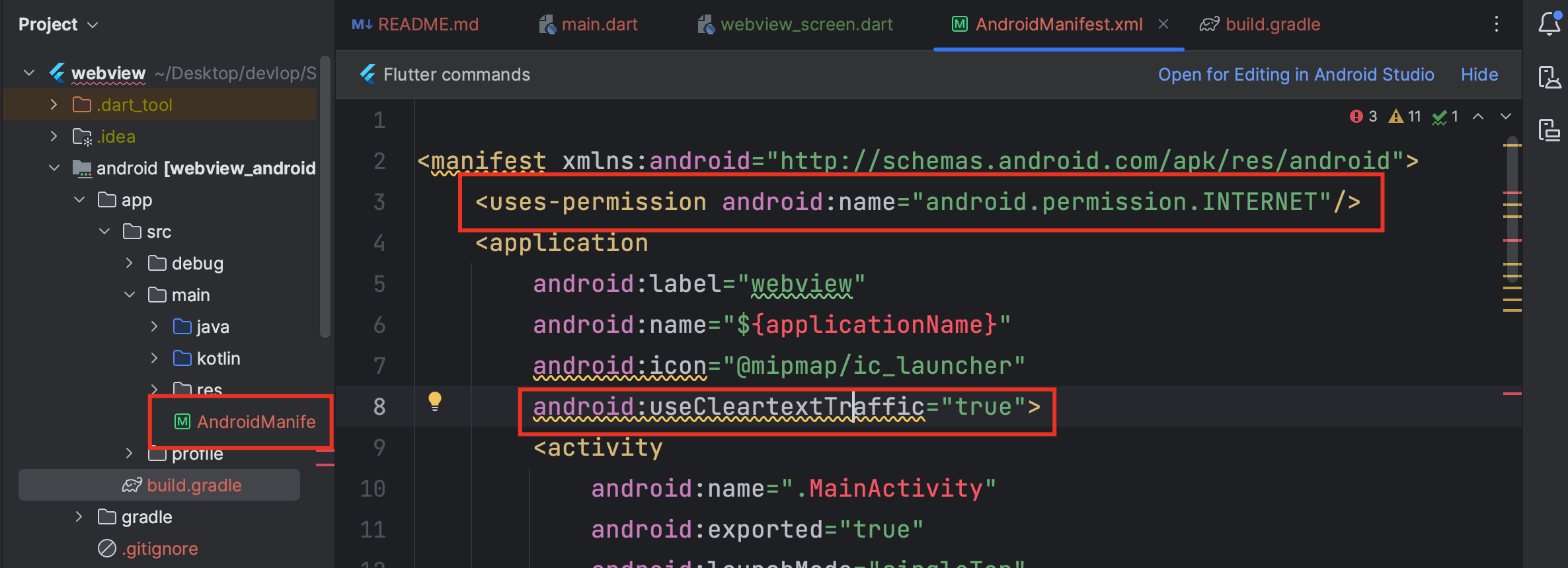 - AndroidManifest.xml파일에서 인터넷 권한을 추가해줌